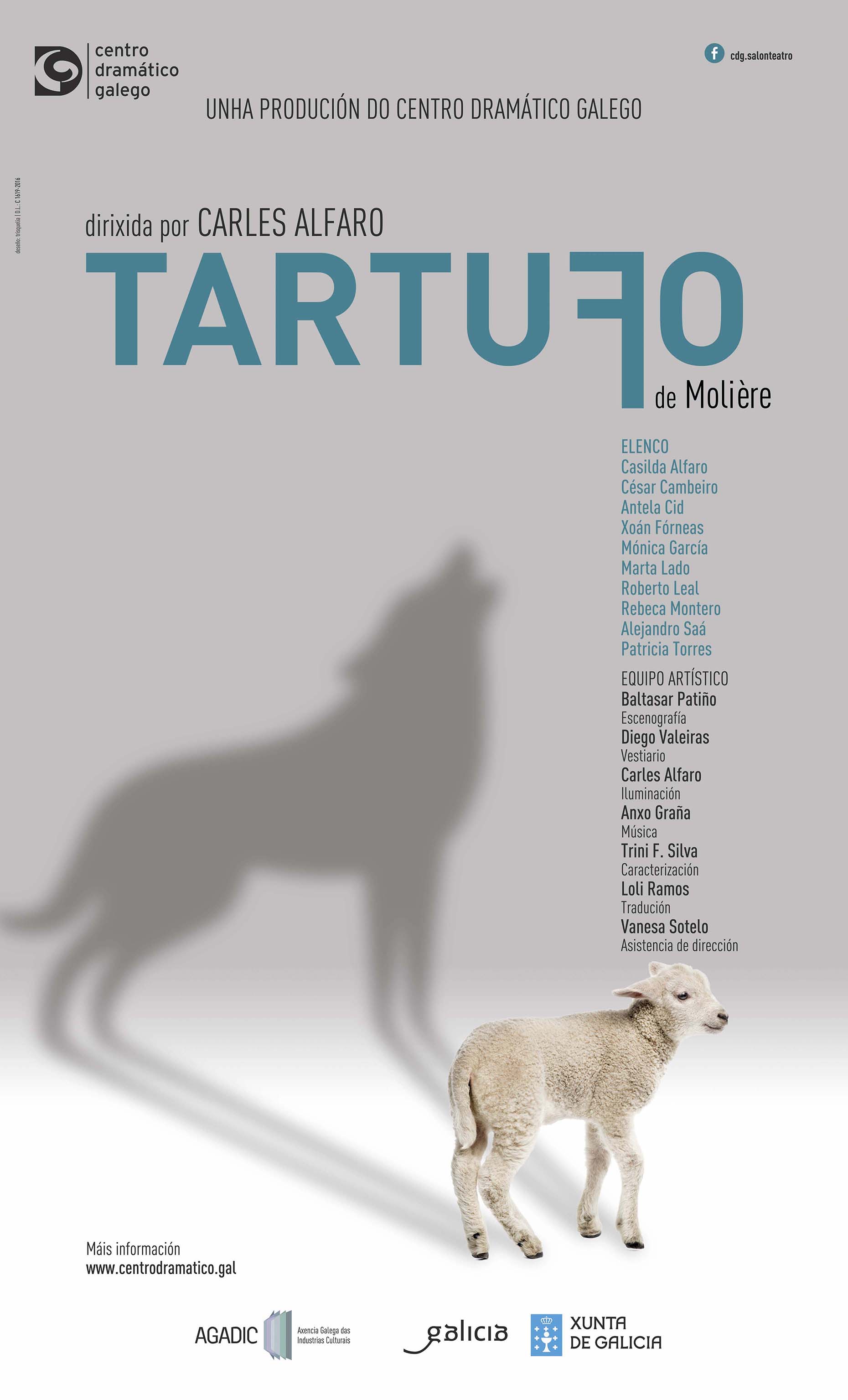 Autoría: Jean-Baptiste Poquelin, Molière Dirección: Carles Alfaro Escenografía: Baltasar Patiño Vestiario: Diego Valeiras Iluminación: Carles Alfaro Música orixinal: Anxo Graña Caracterización: Trini F. Silva Tradución: Loli Ramos Asesoramento lingüístico: Roi V. Ponte Asistencia de Dirección: Vanesa Sotelo Escenografía e Utilería: Equipo técnico do CDG Estructura metálica: Armesa Vestiario: Equipo técnico do CDG e do CCG Prensa: Ana Rosales e Ana Miragaya (Comunicación Agadic) Fotografía: Vanesa Vázquez Deseño gráfico: Trisquelia